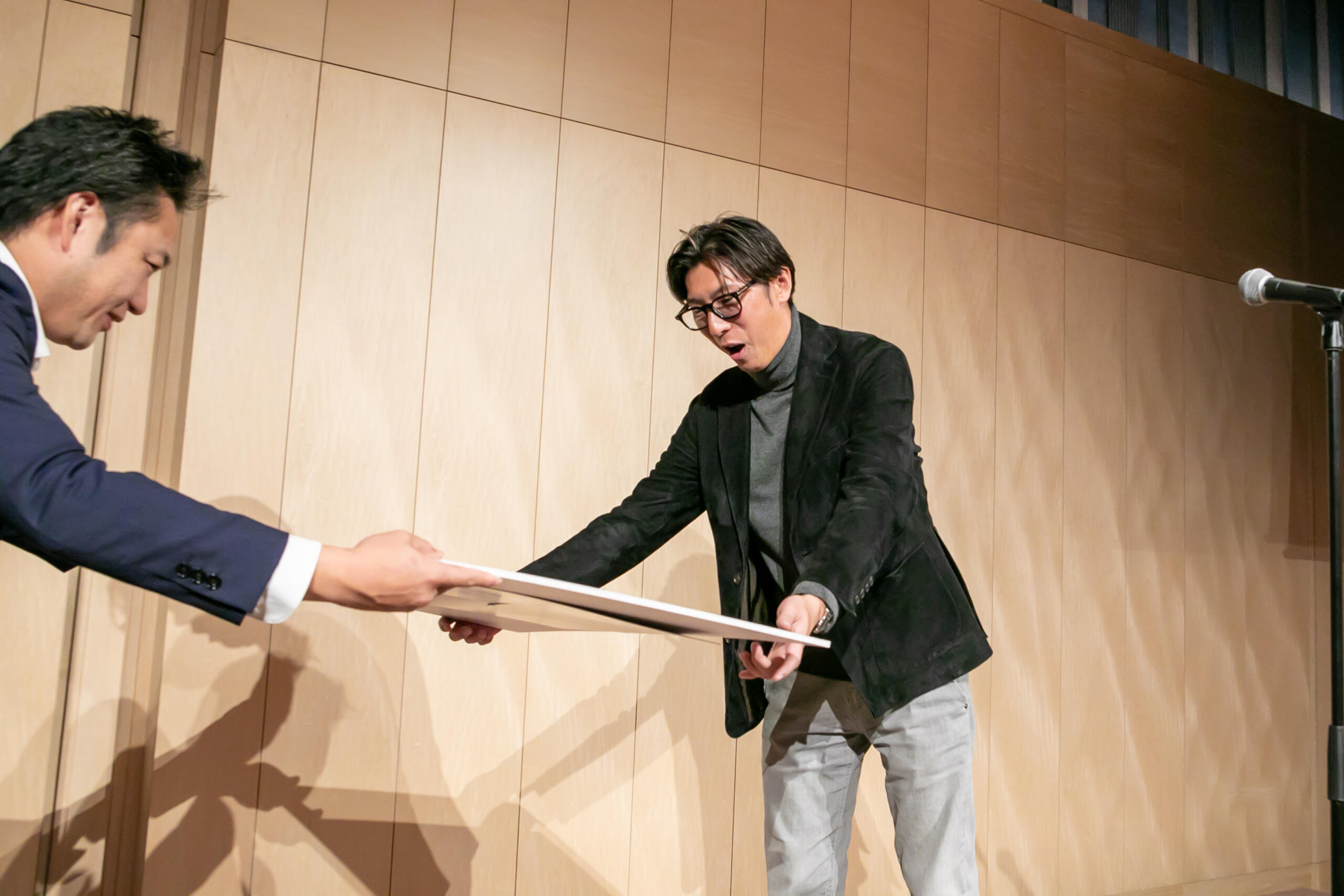 プレゼンターとして登壇したのは、事業本部長の山瀬 倫生さん。 何も知らされていない社長、名前を呼ばれてこの表情です(笑)。
