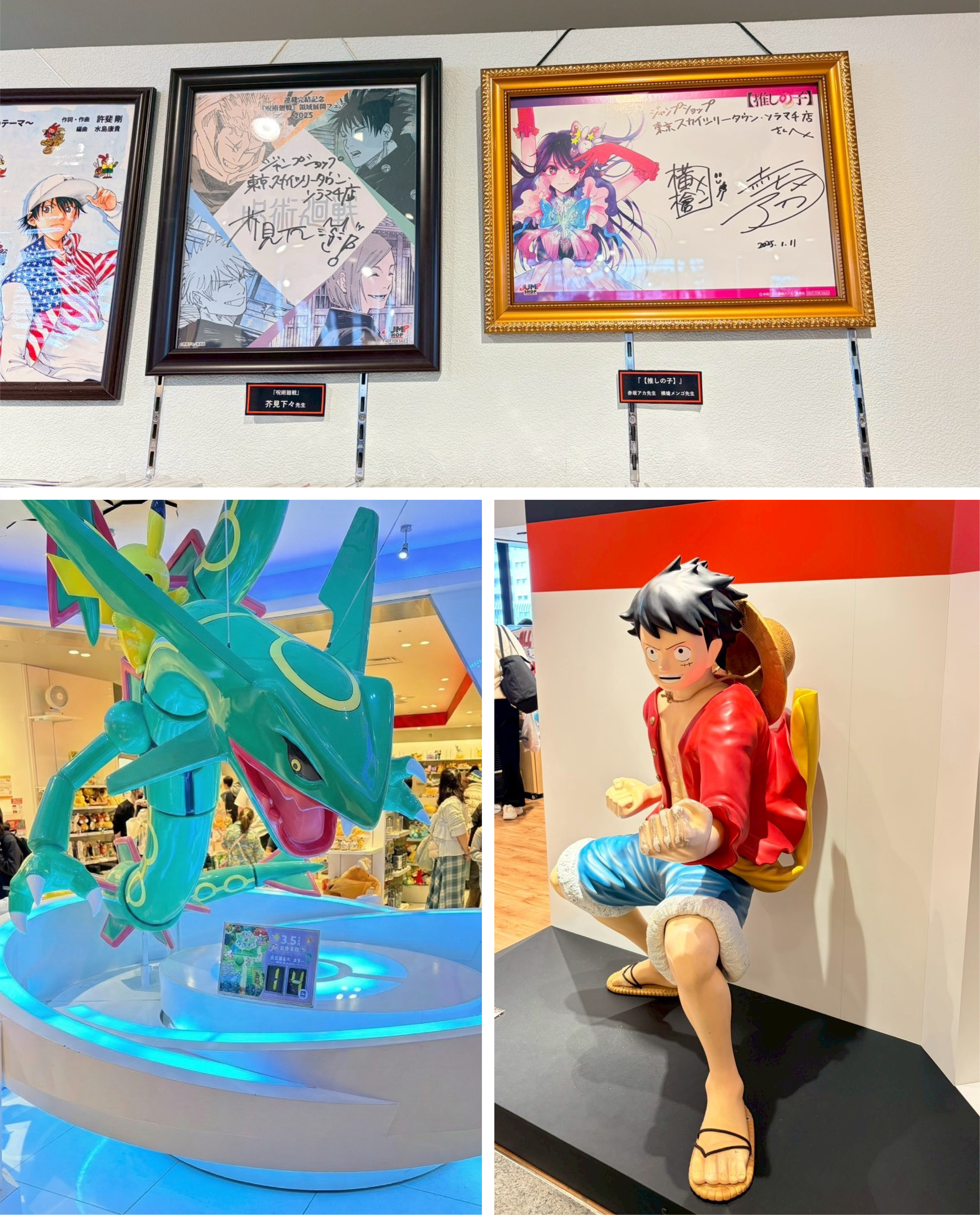 ポケモンセンター&JUMP SHOP:レックウザの巨大オブジェや、『ONE PIECE』ルフィのフィギュア、人気作家さんのサイン色紙など、ファンにはたまらない展示が盛りだくさん!
