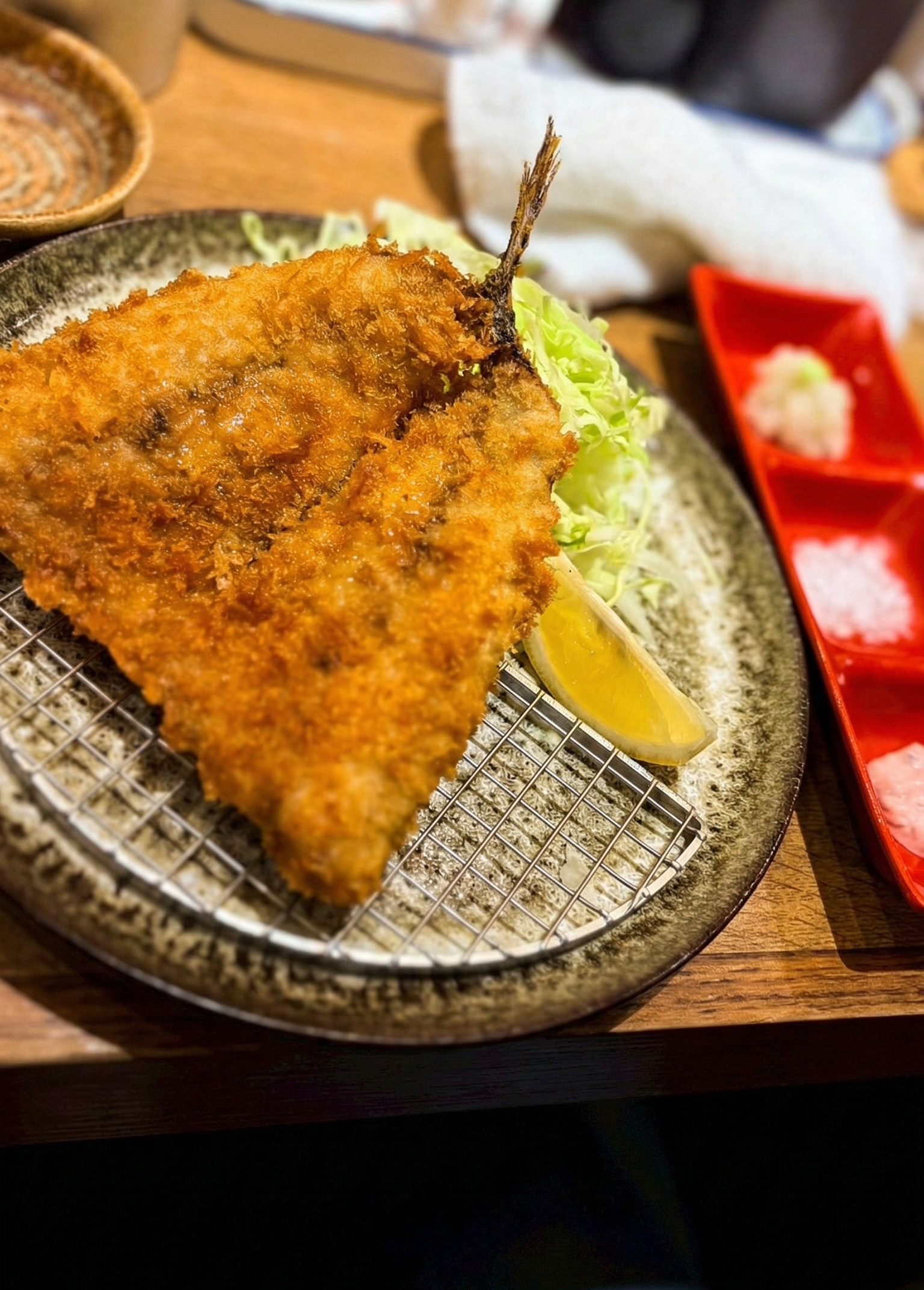 まず驚いたのが、このアジフライのボリューム! 外は驚くほどサックサク、中はフワフワで肉厚。レモンを絞っていただくと、脂の乗ったアジの旨みが口いっぱいに広がります。