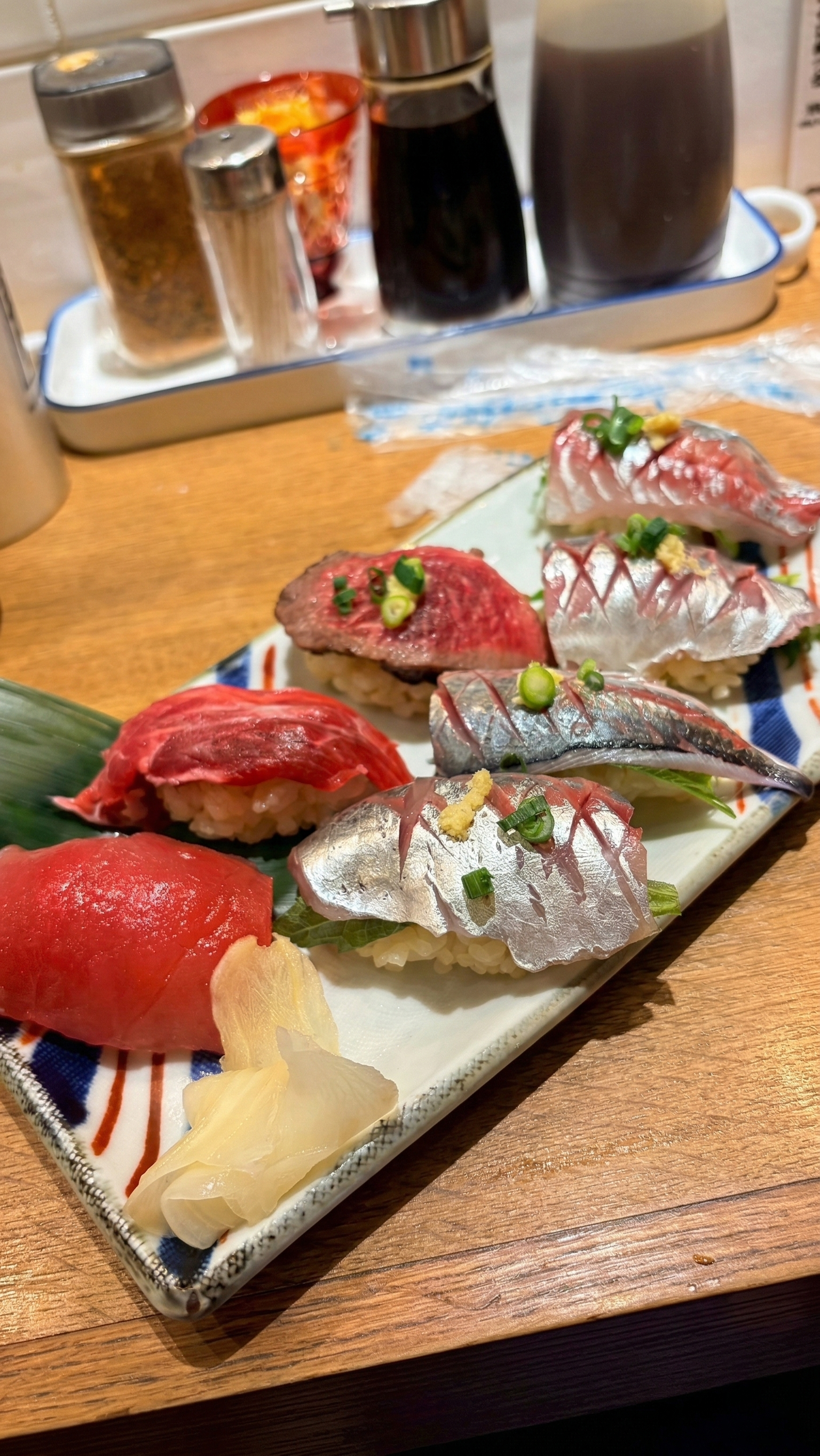 続いて、新鮮なネタが並ぶお寿司。 定番のマグロや光り物はもちろん、お肉の握りまで楽しめる贅沢な一皿です。一貫一貫が丁寧に握られていて、まさに旅のご褒美。