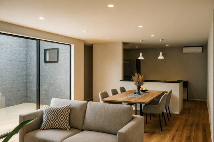突板フローリングとハイドアを採用し、空間を広く見せる上質な室内デザイン。