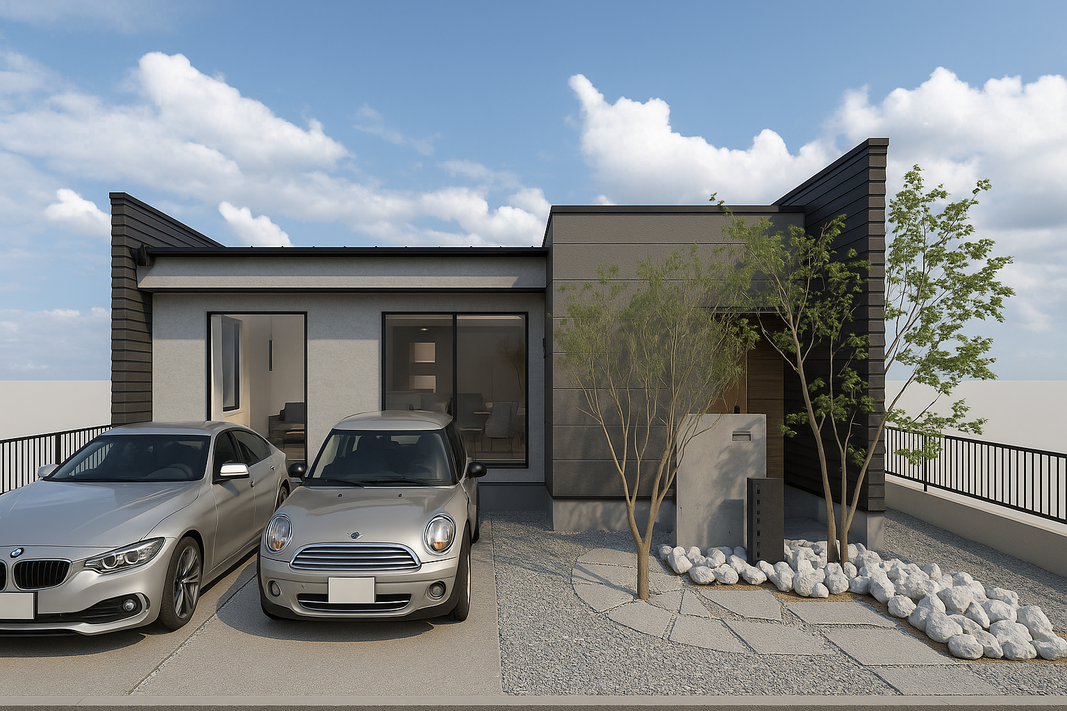静けさの中に確かな存在感を放つ、グレーのモダン平屋。