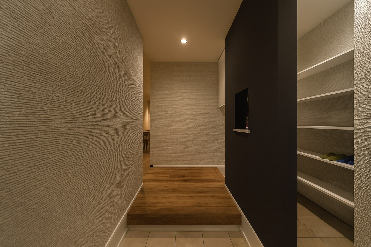 さらに、玄関内にはニッチを設け、鍵や小物、季節のアクセサリーご家族の写真を飾れるスペースも。
