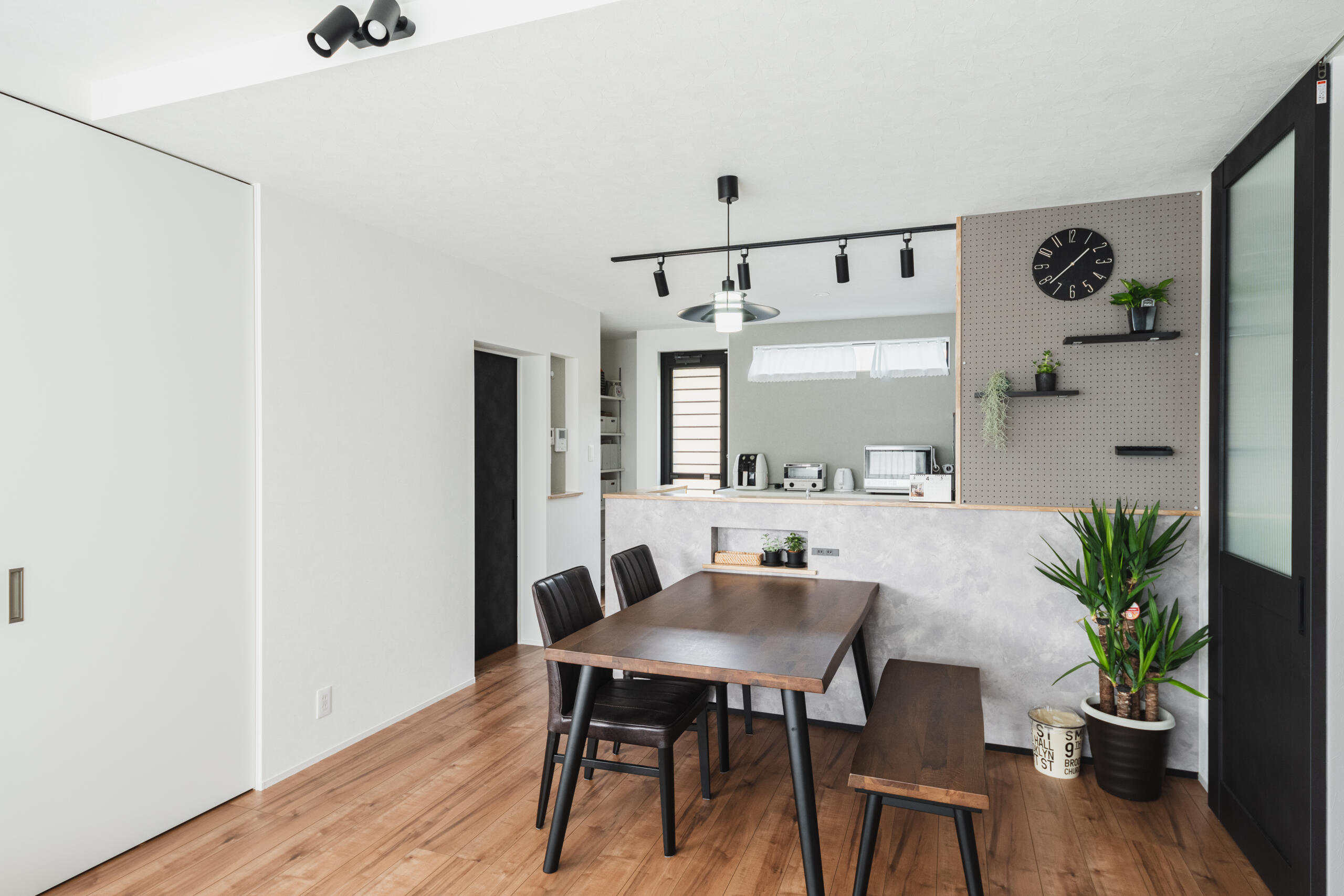 16帖のLDKに直線水回り(キッチン→洗面→浴室)を並べた“家事ラク動線”。