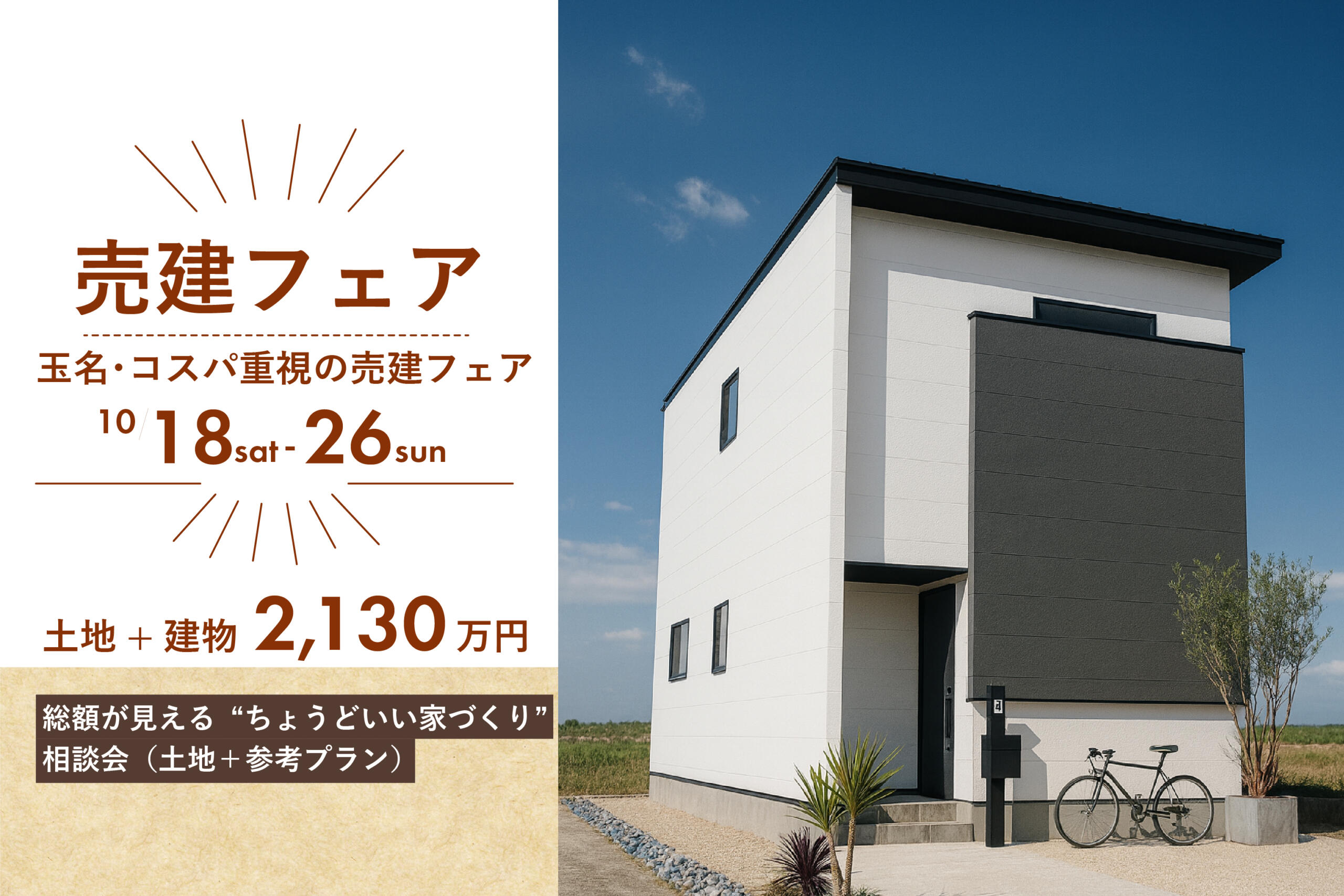 玉名市中の土地をベースに、参考プラン+概算総額+月々目安をその場でご提示する売建フェアです。