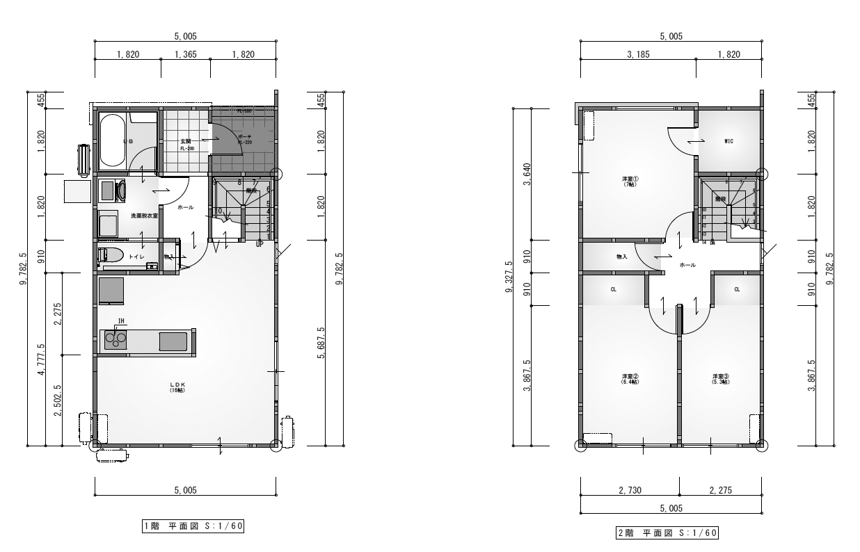完成イメージの外観・内観パースと1F/2F平面図を見比べながら、サイズ・色・素材のバランスを確認できます。