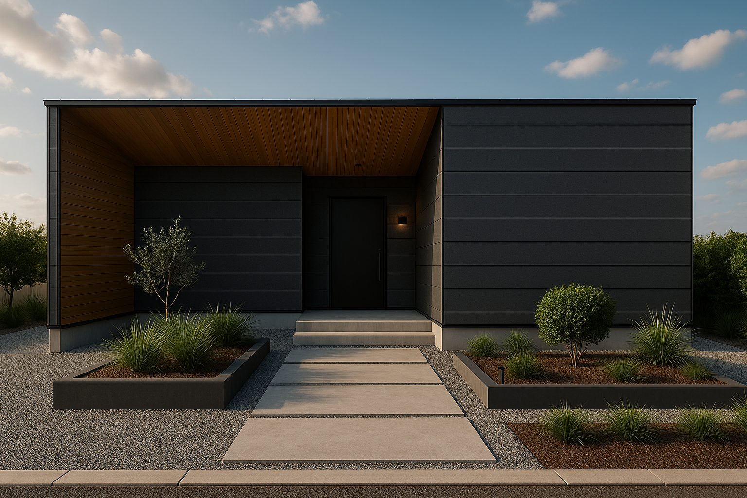落ち着いたグレーの外観に木目のアクセントが映える、スタイリッシュな平屋が完成しました。