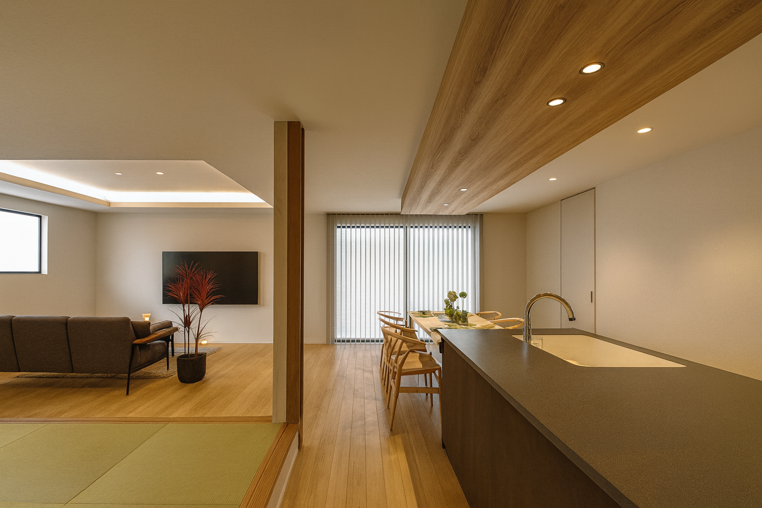 キッチン側は木目の折り下げ天井で低く包み込み、ダイニング〜リビングは折り上げ天井で伸びやかな広がりを演出。照明計画と相まって、明暗のグラデーションが上質な居心地を生み出します。