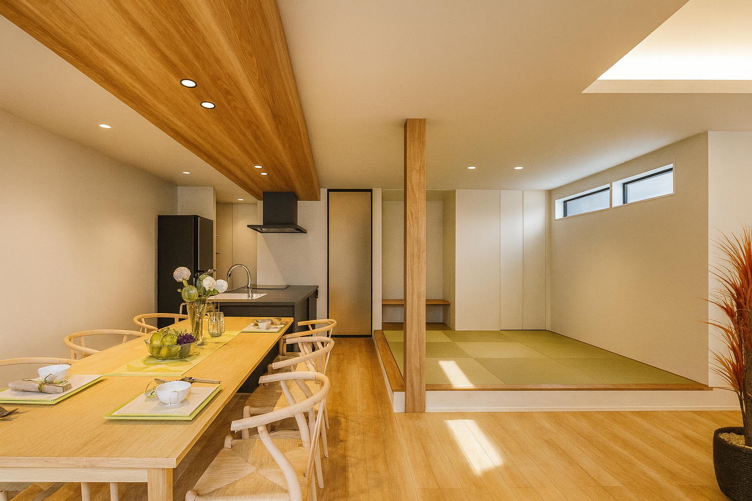 主寝室+子ども部屋2室に加え、リビングと緩やかにつながる畳コーナーをプラン。お昼寝・遊び場・客間・ワークスペースなど多目的に使え、家族の距離感が心地よく保てます。