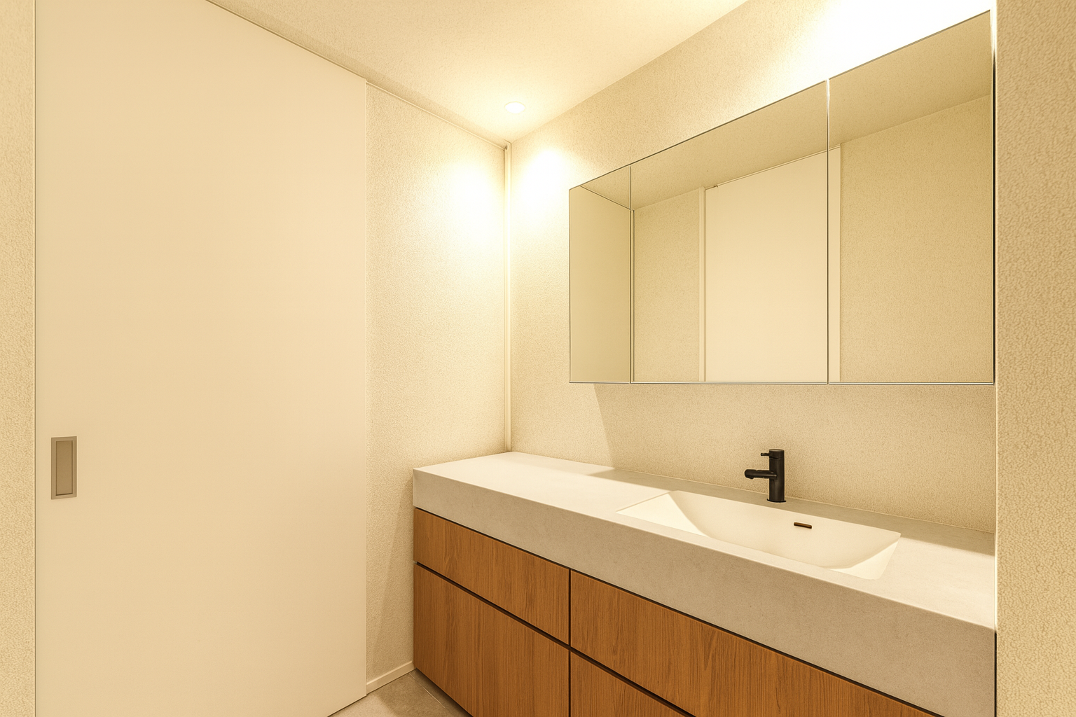 キッチンから水回りへスムーズにつながる動線で、家事がコンパクトに完結。パントリーや各室クローゼット、リビング収納を要所に配置し、“出しっぱなし”になりにくい計画です。