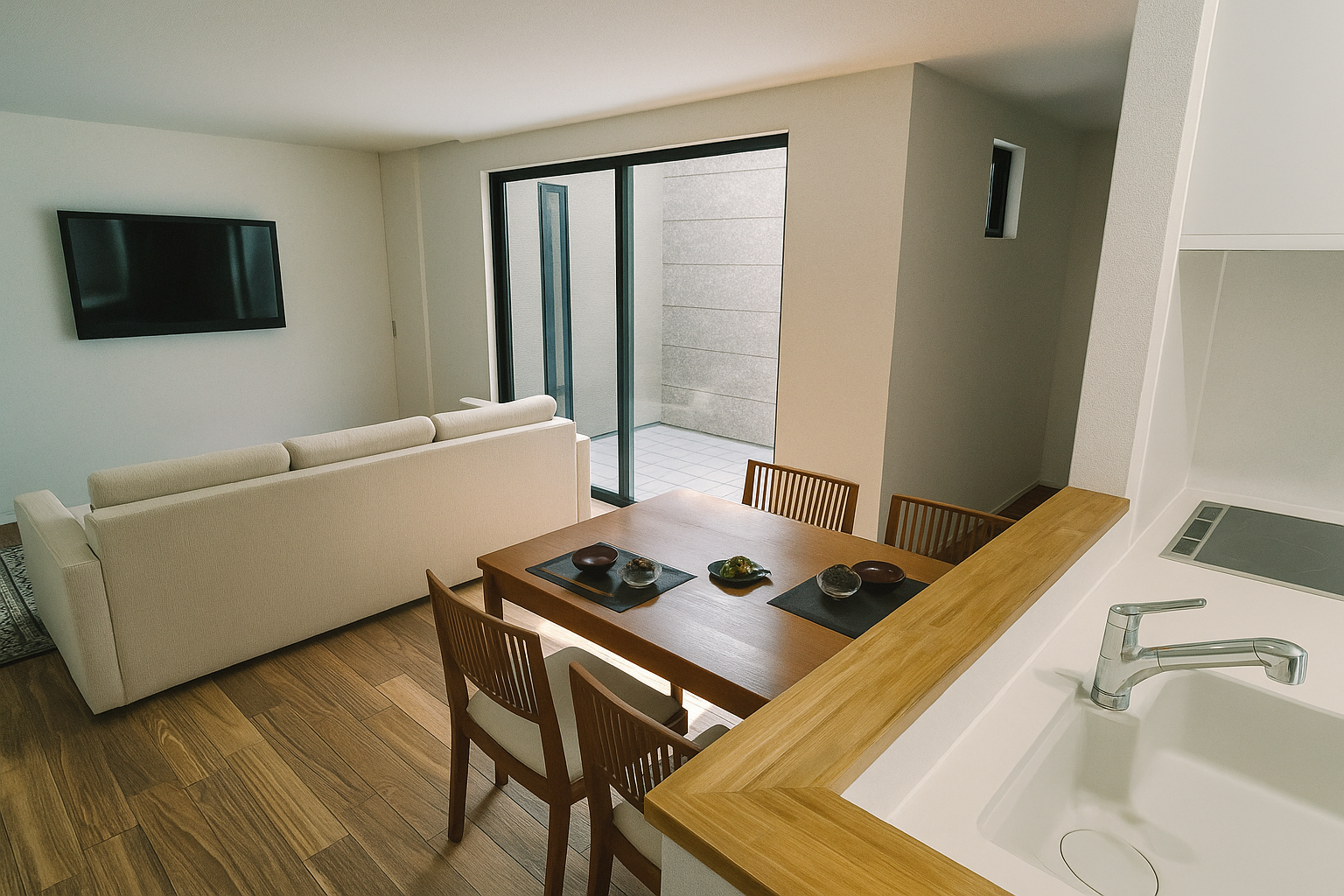 外装には吹付材を採用、内部はガラス戸や天然木の床材を採用し、注文住宅では叶えにくい中庭も採用。間取り、デザイン、機能性、一切妥協しておりません。
