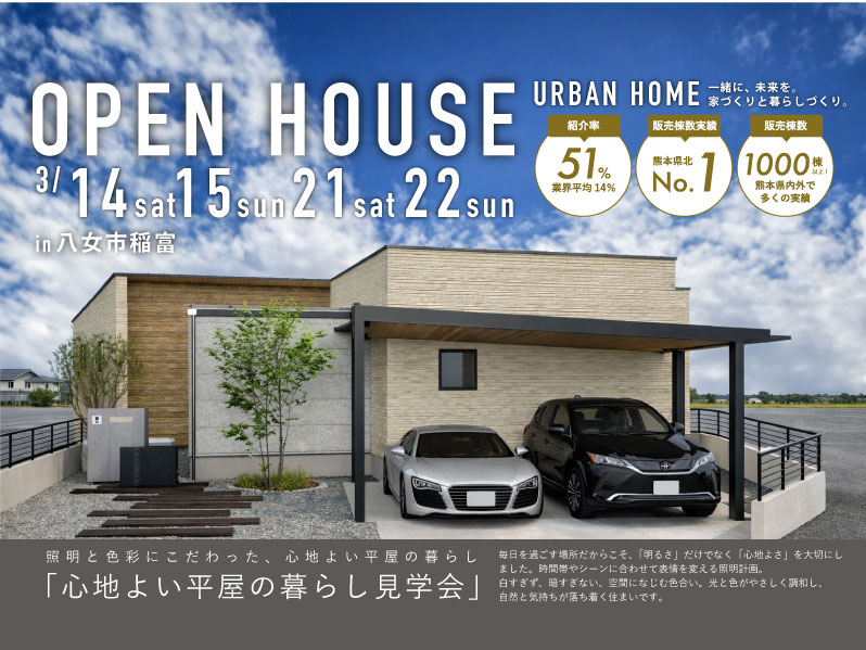 2008年に福岡県大牟田市で事業を開始し年間契約20棟弱から始まった私達の家づくりは年々棟数を伸ばし続け、2015年には通算契約棟数300棟、2019年には140棟以上の契約を達成いたしました。その甲斐あって、熊本県北地域(荒尾玉名地区)で商圏販売棟数ナンバーワンという輝かしい称号をいただきました。同時に実店舗も熊本県荒尾から玉名〜福岡県柳川へ範囲拡大し2017年には熊本市内の平成へ、2018年には沖縄にもオフィスを構え、2020年には佐賀へ出店いたしました。全てはご支持を頂いている地域の皆様のお陰でございます。これからもアーバンホームは地域密着しお客様に寄り添う事を大切に、地元・皆様のお役に立てるように精進してまいります。