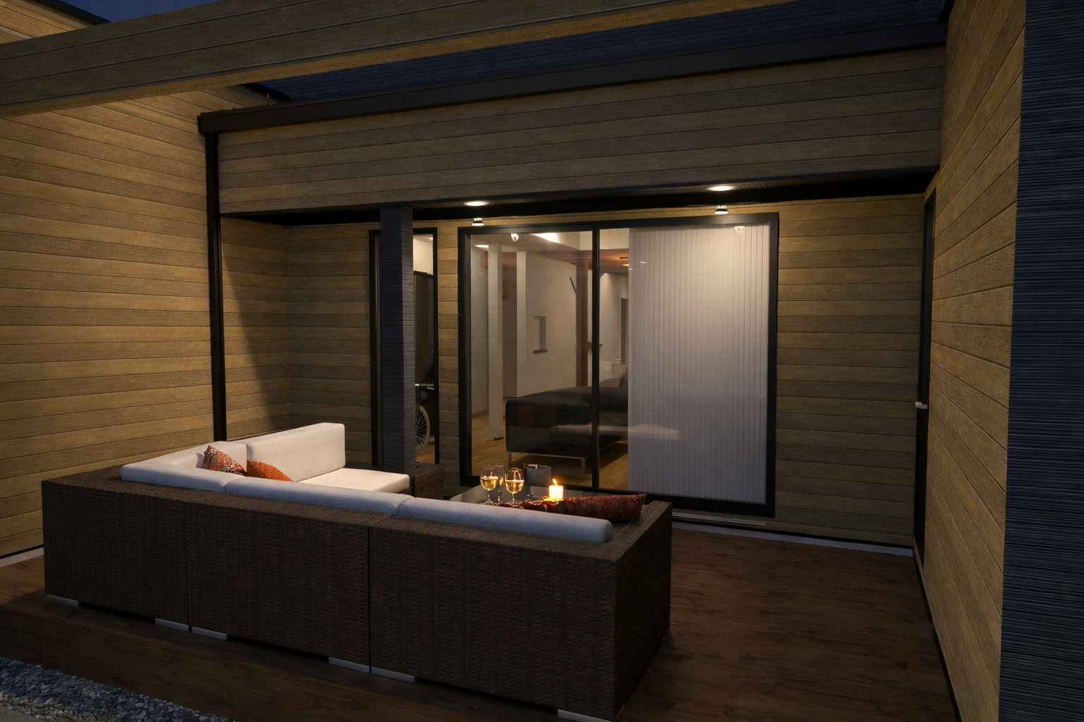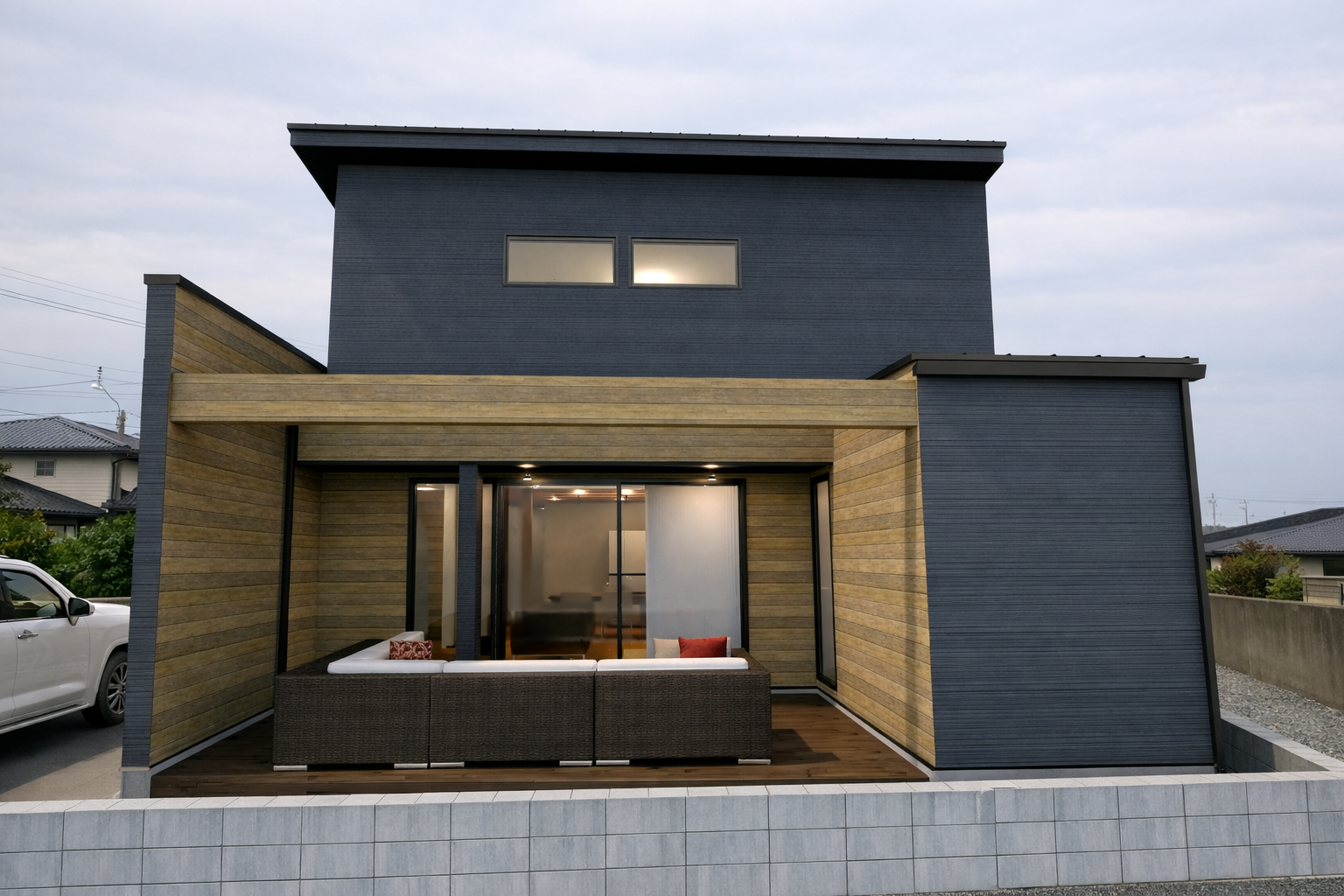 Point1レッドシダーが引き立てる、外観デザインとアウトドアリビング
