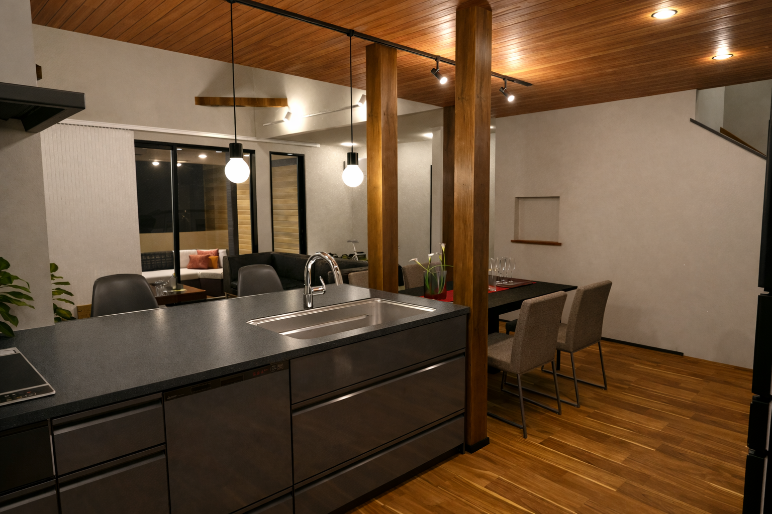 昼は光を取り込みながら開放的に、夜は照明で落ち着いた雰囲気に。