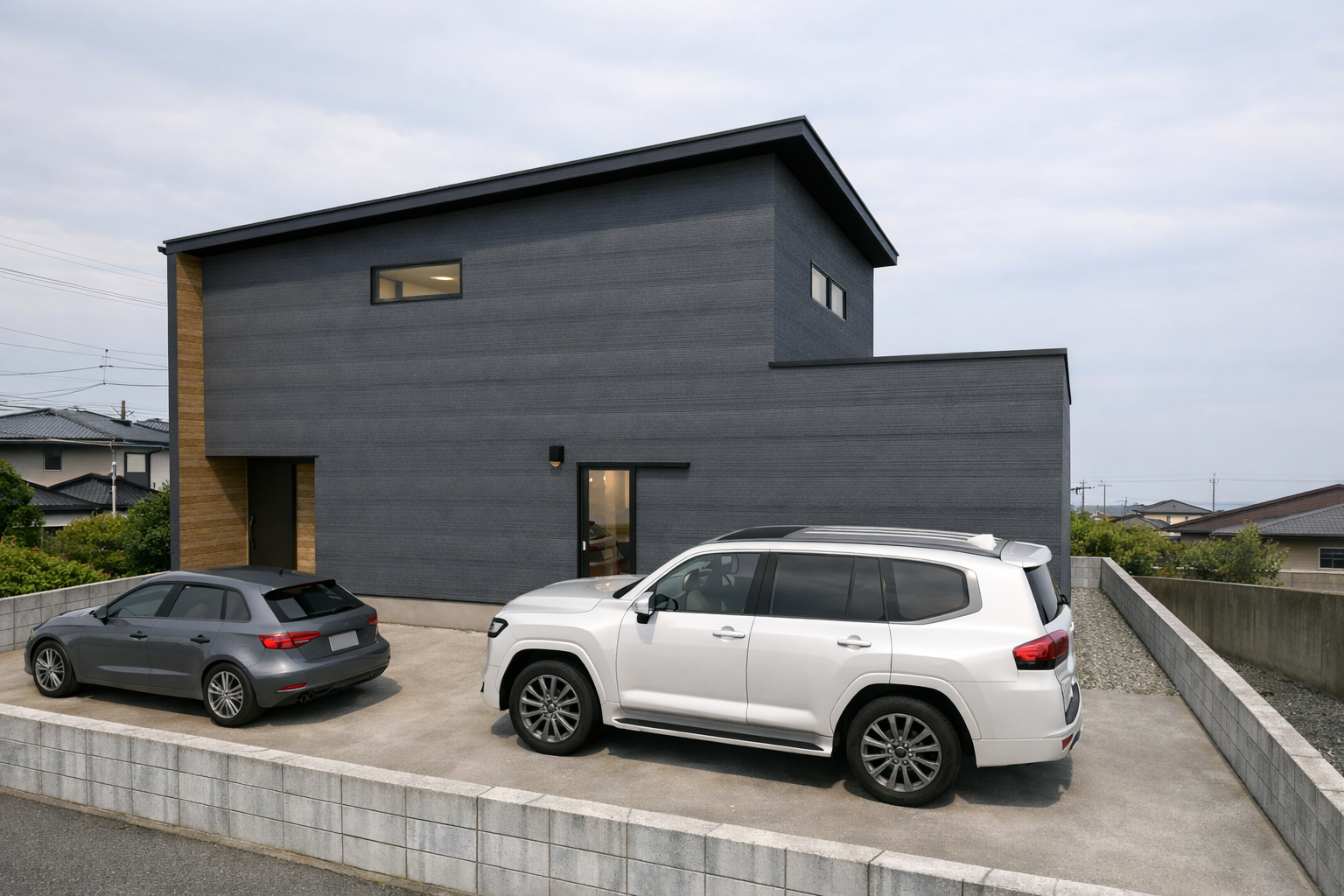 ネイビーの外壁にレッドシダーの木目が映える、上質感のある佇まい。