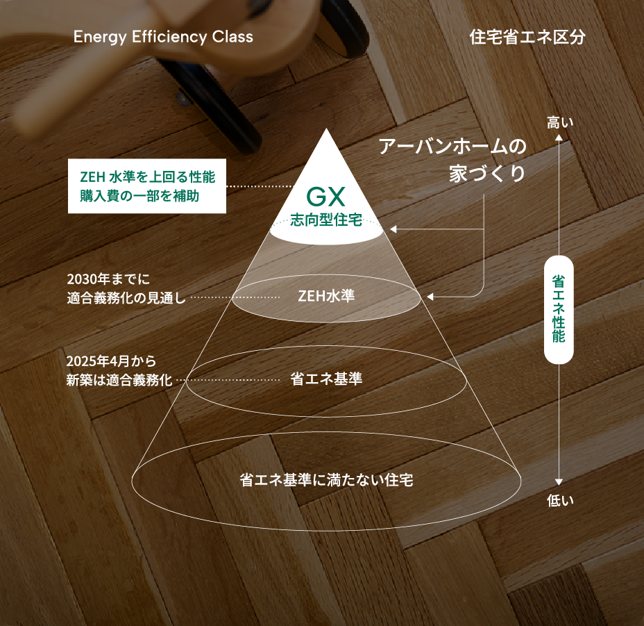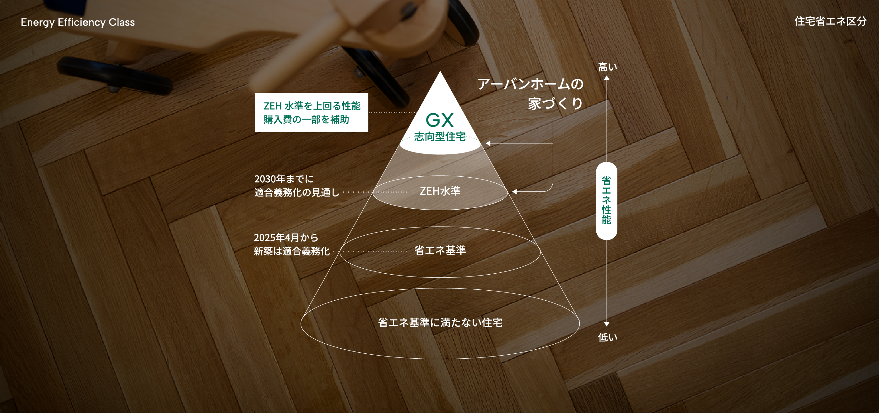 GX志向型住宅とは、GX(グリーントランスフォーメーション)の考え方を取り入れ、エネルギー消費を抑えながら快適な暮らしを実現する、これからの時代に求められる住まいです。高断熱・省エネ・創エネを組み合わせ、環境にも家計にもやさしい住環境を実現。アーバンホームは、将来を見据えた安心で快適な住まいづくりを提案します。