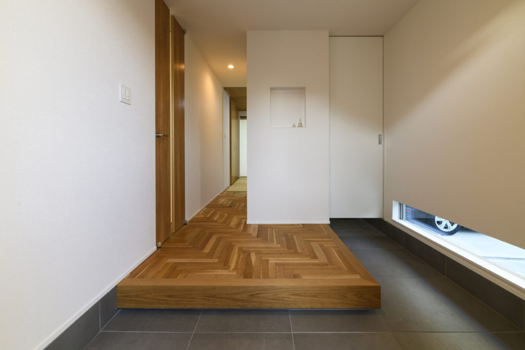こだわりが詰まったシンプルなお家。ヘリンボーンの床が個性的!