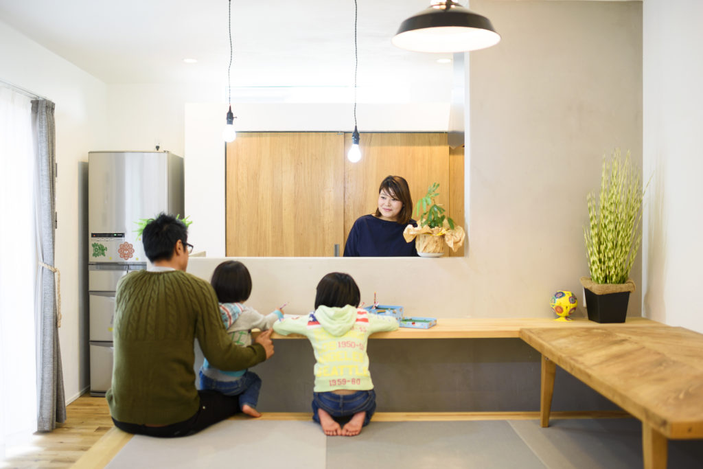 また、対面キッチンの前に小上がりの畳スペースを設けたMさん。食事は畳の上でとり、昔ながらの家族だんらんのひとときを楽しんでいるそう。さらに、キッチン近くに洗面や浴室を設けて家事動線を短くし、家事効率をUP!料理と洗濯をテキパキと同時進行でき、家事もラクになったそう。