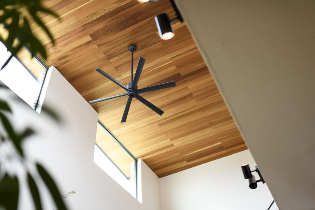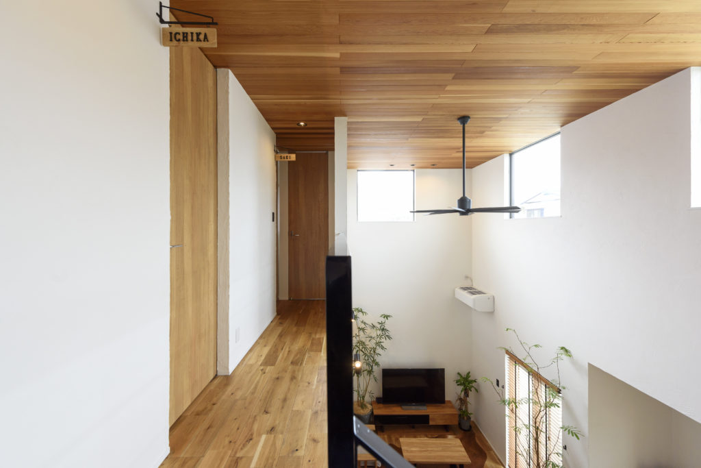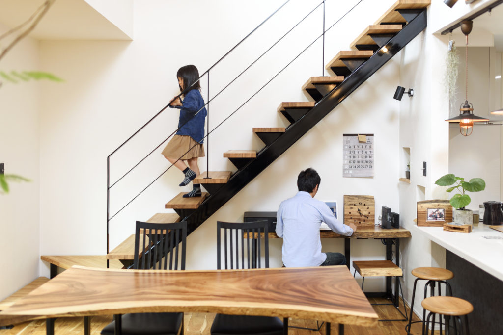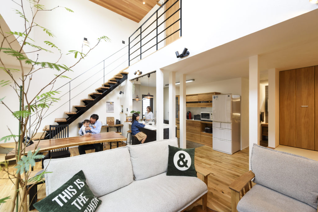 木材とガルバリウムを組み合わせた外観など、シンプルモダンな雰囲気の良さに惹かれたのが、Fさんがアーバンホームに依頼した決め手のひとつ。また、すでに間取りのイメージがあり、その想いに寄り添ってくれる親身な対応に安心感を抱いたそう。完成した住まいは、1階で生活が完結する回遊式の間取りが特徴。玄関からLDK、水回り、ウォークインクローゼット、主寝室とすべてがひとつの動線でつながっている。家族が集まるLDKは、34.78m2の広さに吹き抜けを設けてダイナミックな空間に。アイアンを使ったスケルトン階段を配し、子どもたちが必ずリビングを通って2階の自室に向かうようにした。