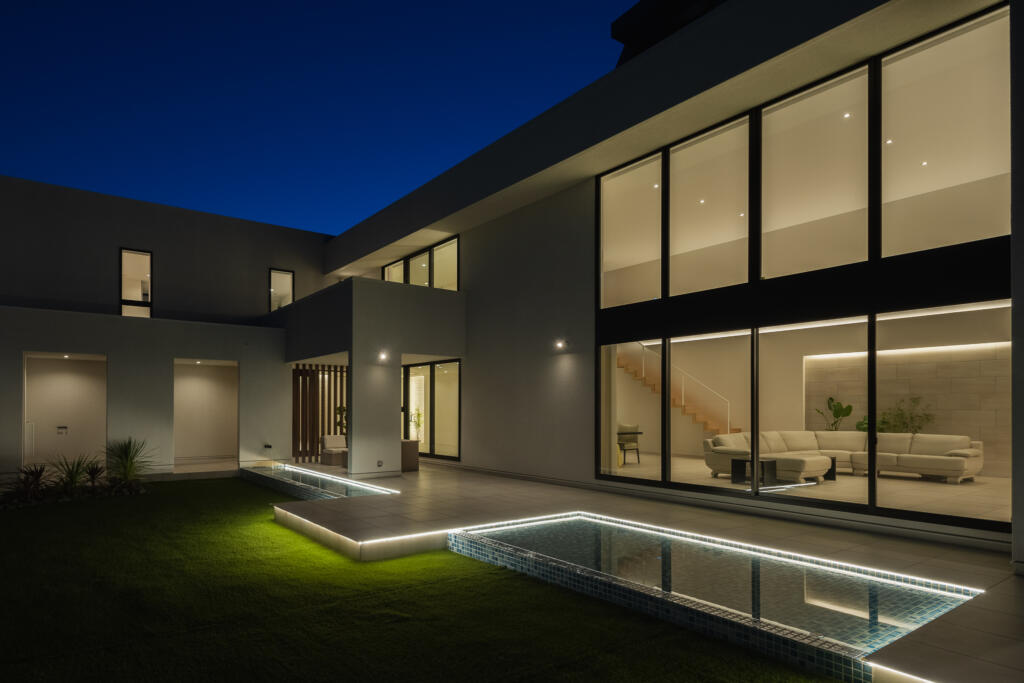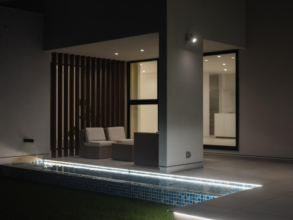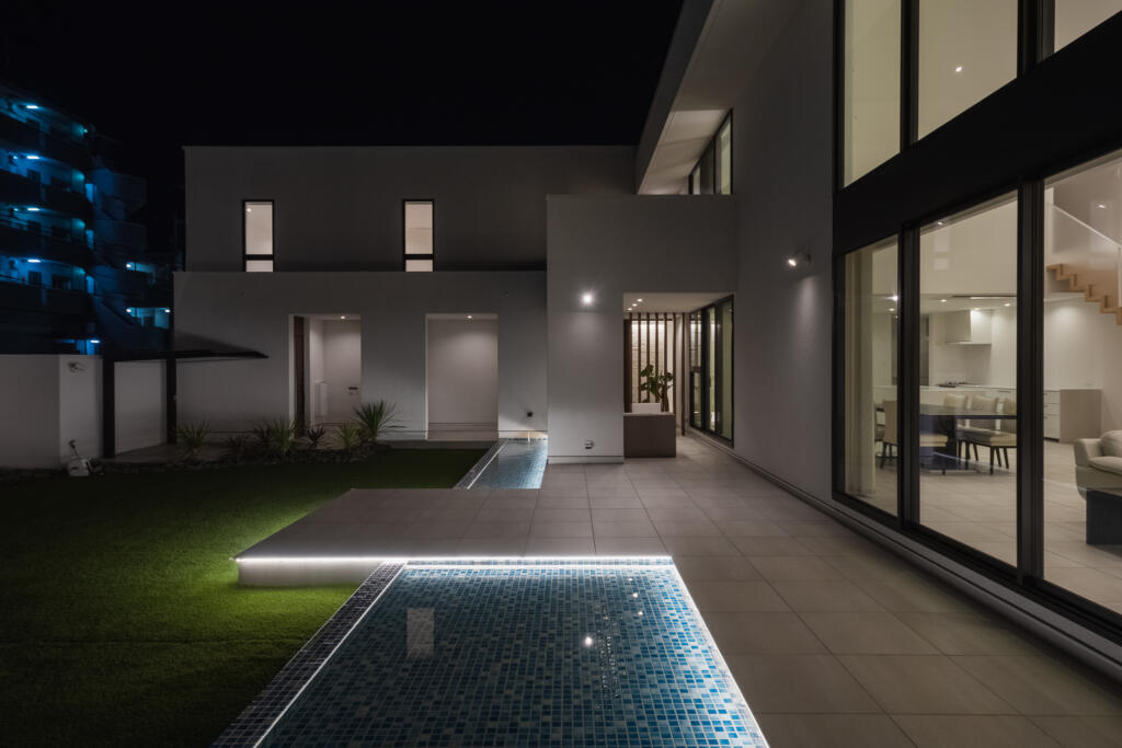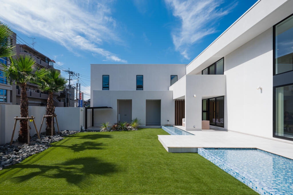 ハワイやカリフォルニアのリゾート住宅にはプール付きのお家が多いため、プールの代わりに水盤を設計したとのこと。