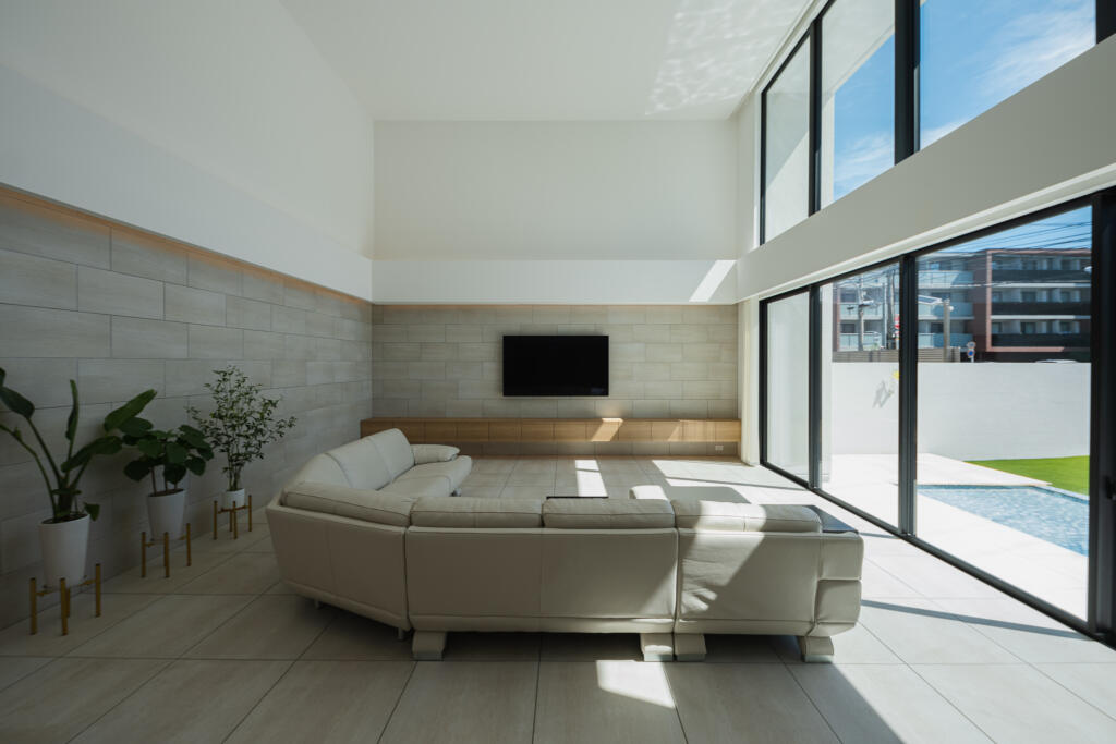 そんなヤシの木を室内のリビングから眺めることもできる設計かつ、外構で人の目も気にならないため、リゾート気分を誰にも邪魔されず思う存分満喫できる贅沢なお家です。