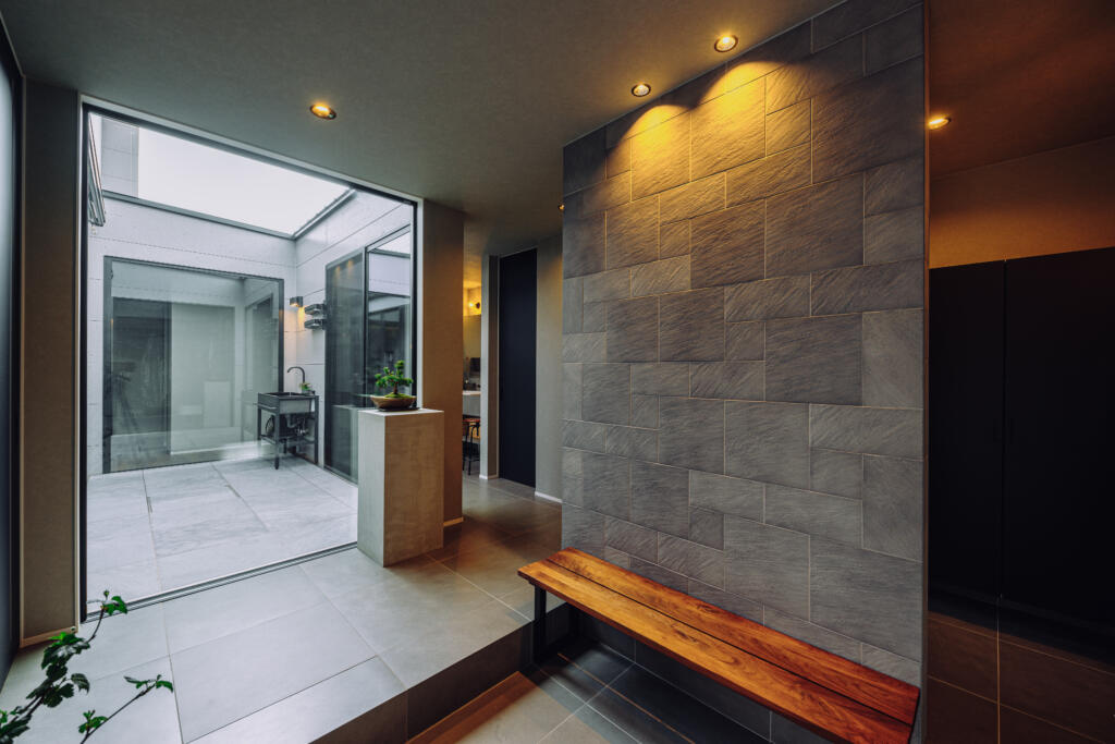 グレーと黒、木目の3色メインで上品にまとめたホテルライクモダンのデザイン住宅。