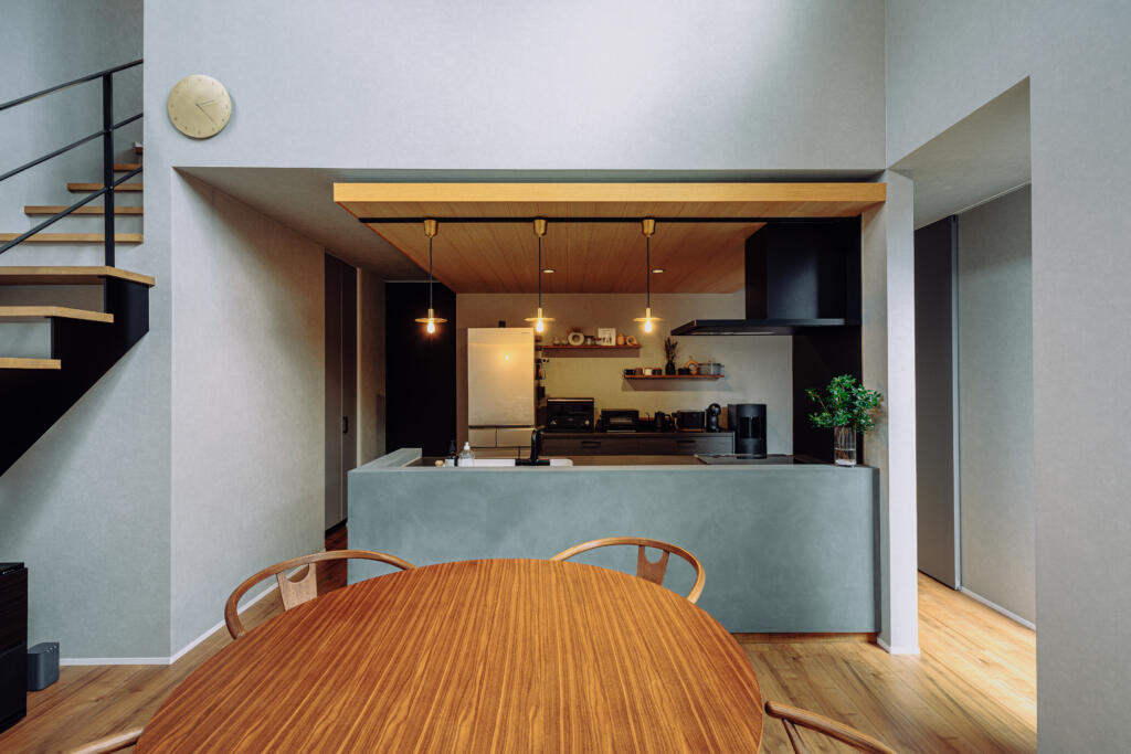 キッチンは釣り下げ天井と間接照明を採用することで、奥行きと広がりの中に落ち着いた雰囲気を演出しています。またリビングと同様オーク材を使用し背面を塗り壁のグレー調に仕上げることで、全体的に三色メインのナチュラルでかっこよく仕上がりました。