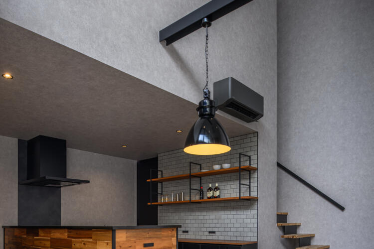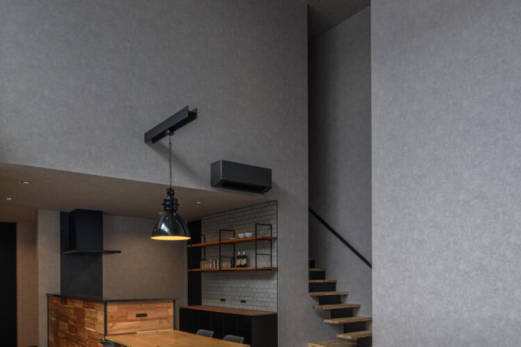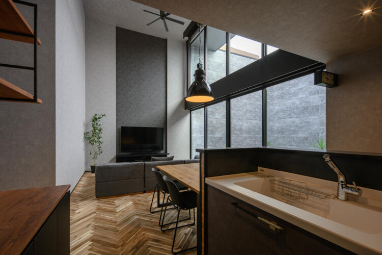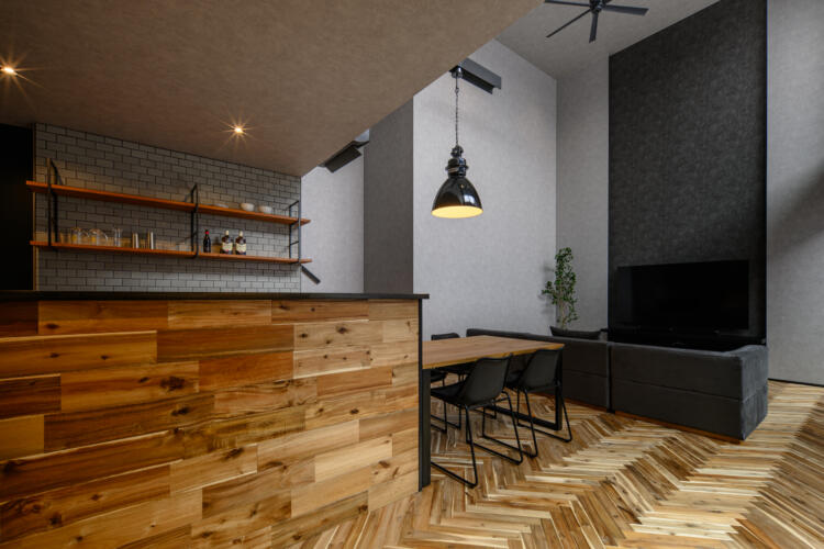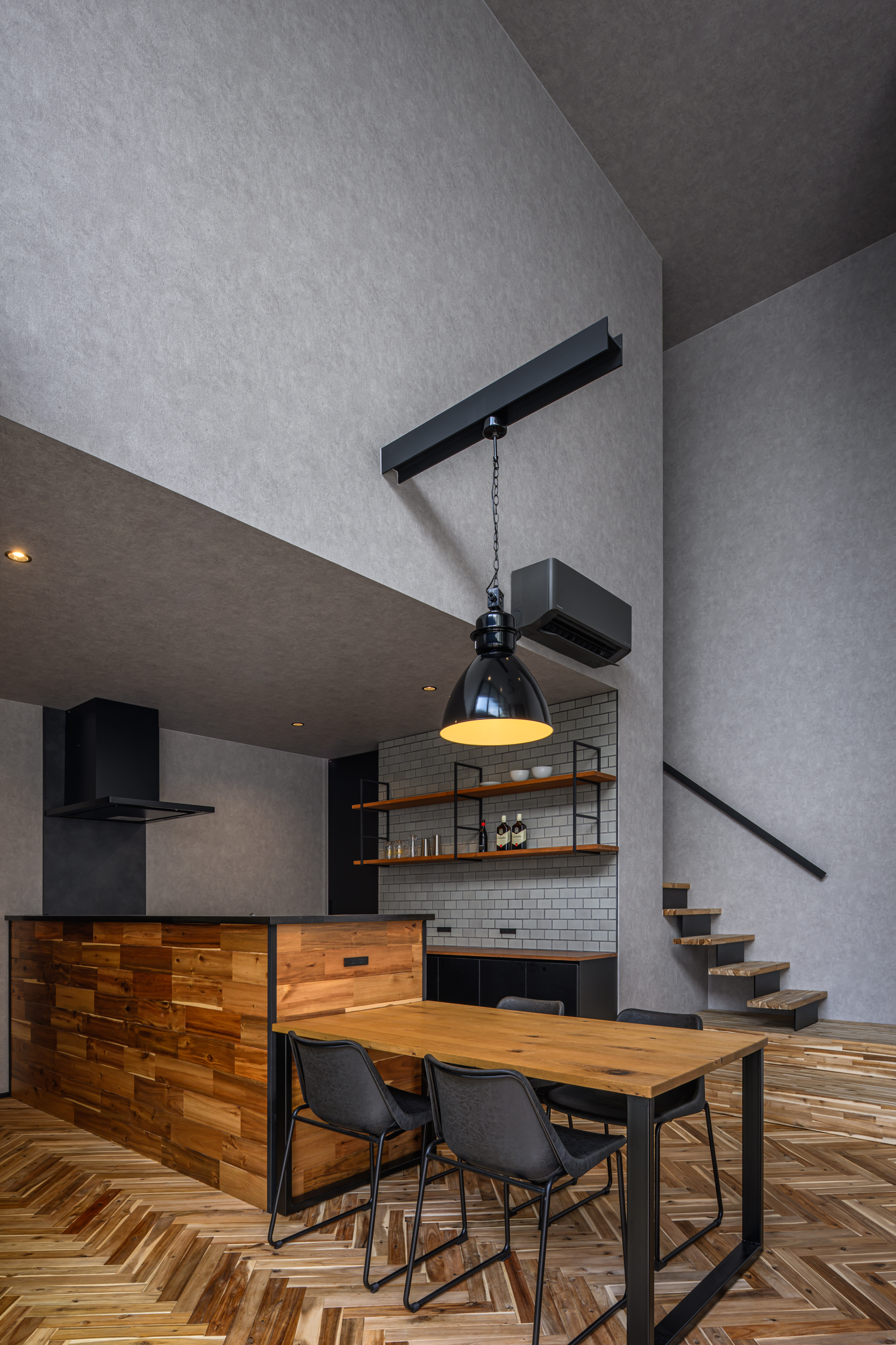 木×ブラックのコントラストが印象的なキッチン・ダイニング。