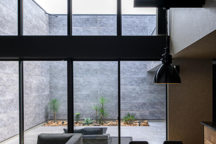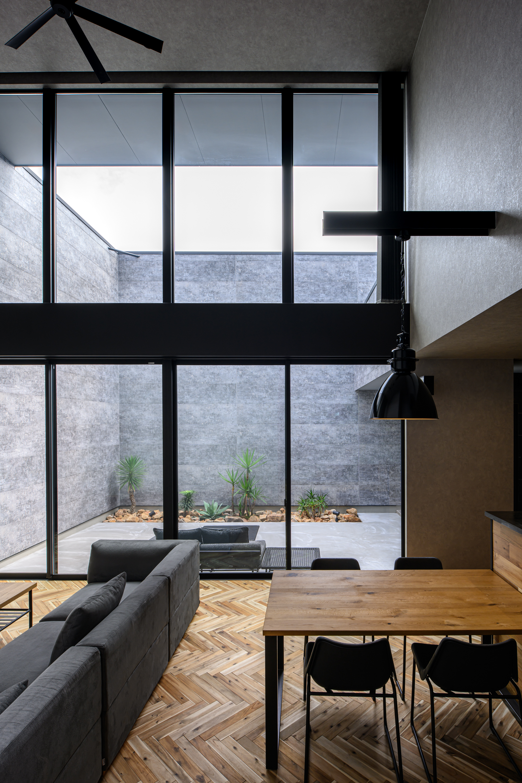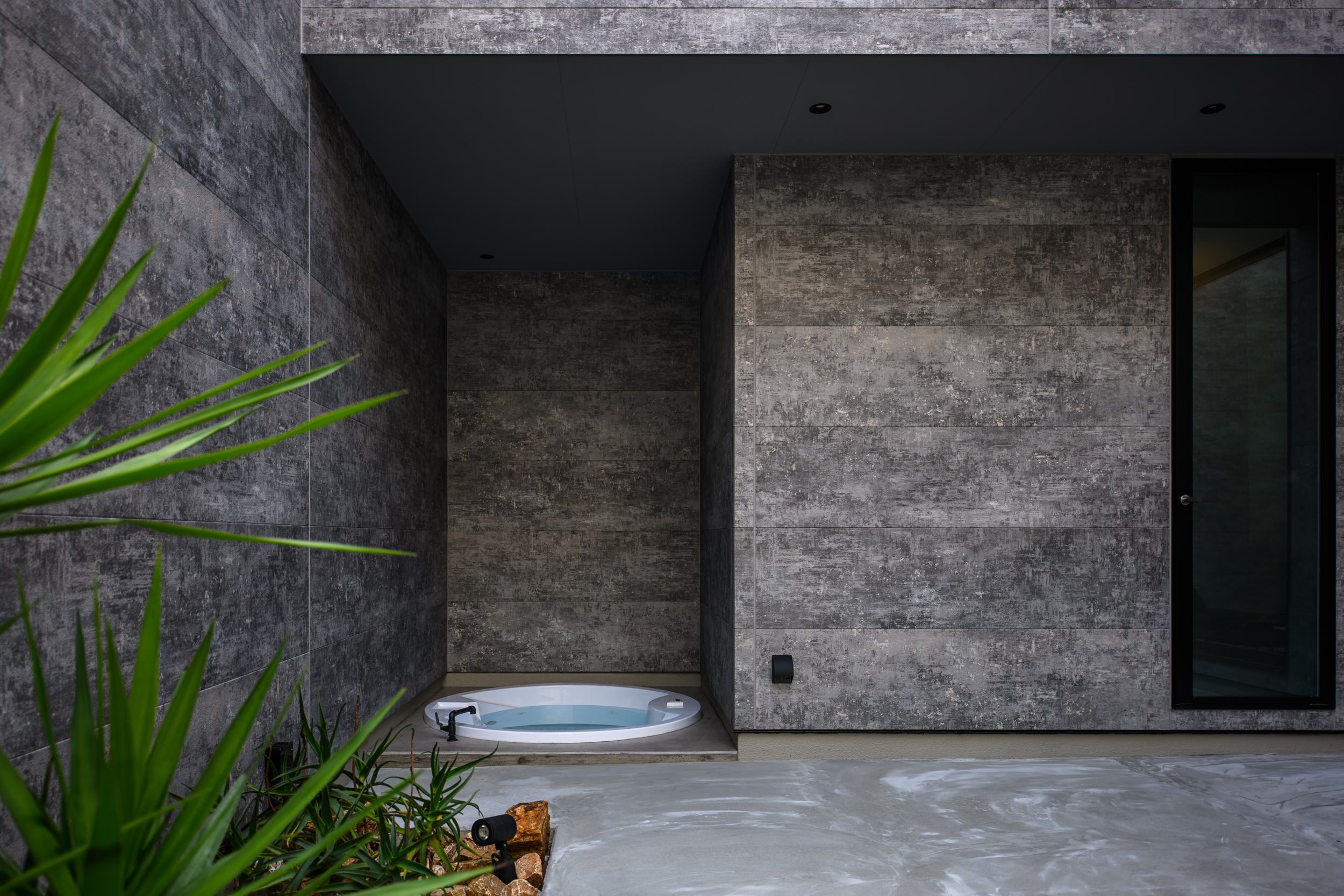 重厚なグレーの壁と滑らかなマテリアルが織りなす、上質な中庭空間。