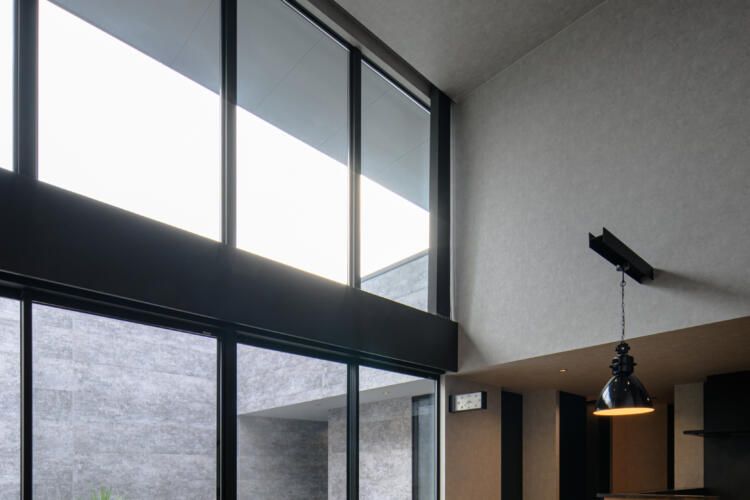 吹き抜けの天井と大開口の窓が生み出す、開放感あふれるリビング。