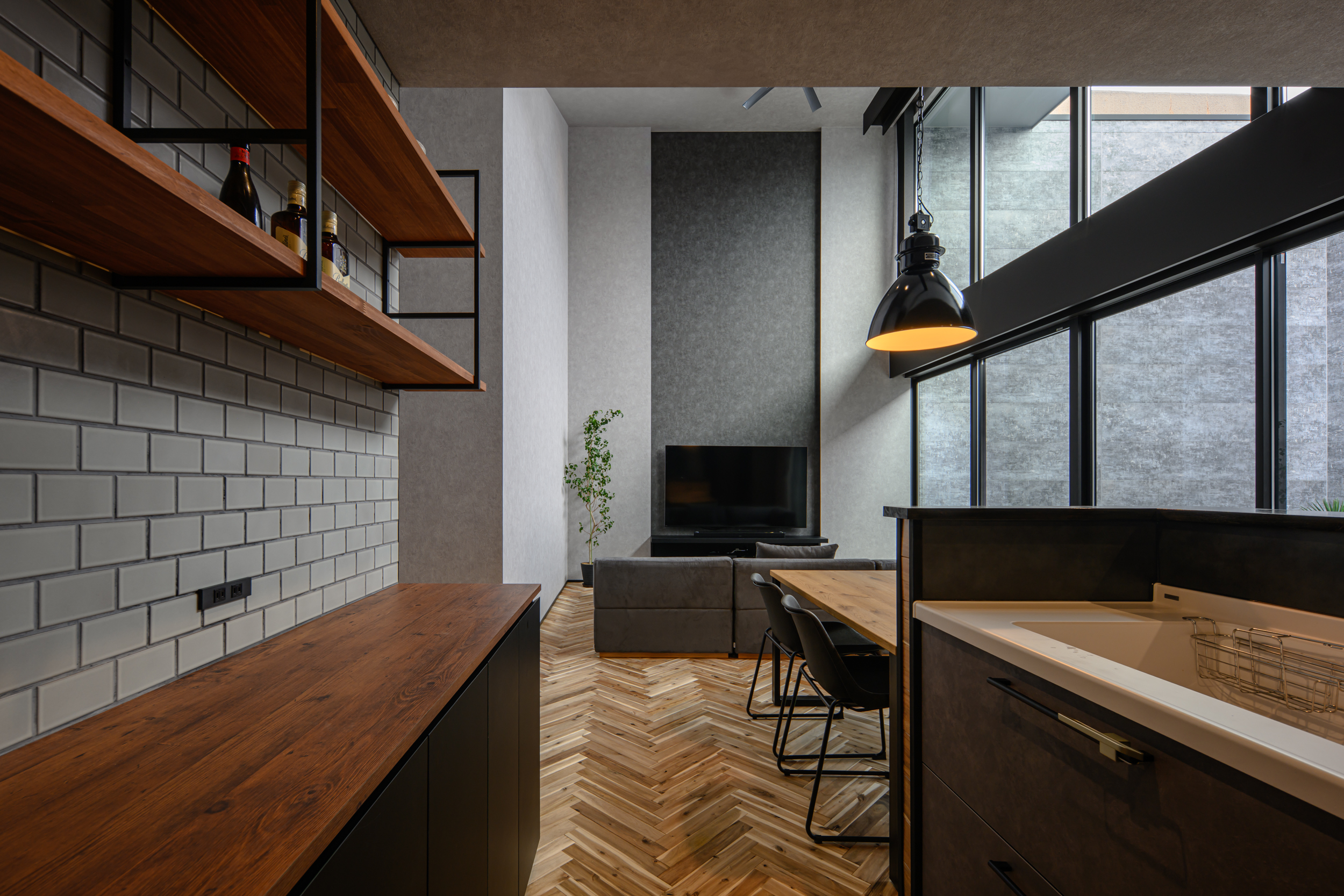 無機質なタイルやアイアンの質感がアクセントとなり、洗練された雰囲気を演出します。