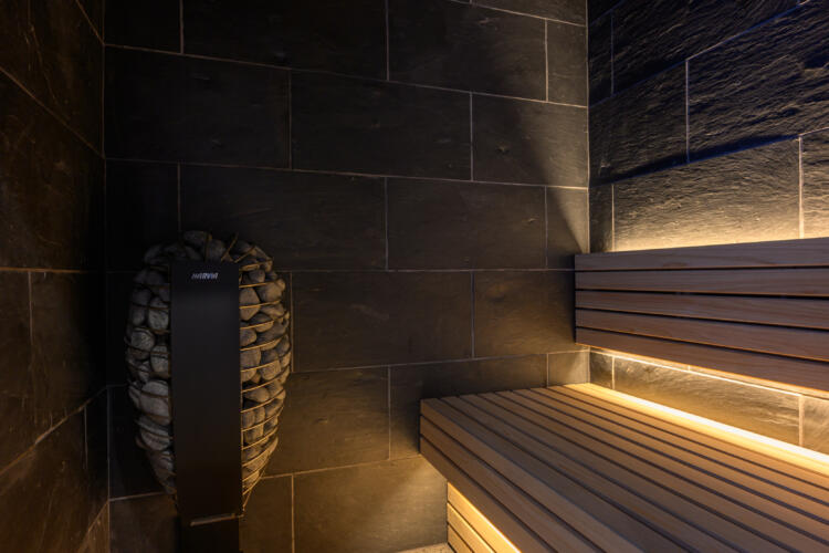 ブラックの石壁に包まれたサウナルームは、まるで高級ホテルのような上質な空間。
